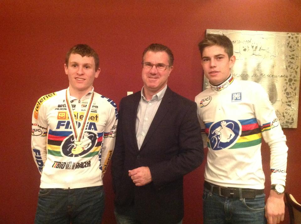 Luc Soens was namens de LM-Classics en de Liberale Mutualiteit aanwezig op de Wereldkampioenschappen Veldrijden in Hoogerheide en op de slotreceptie in het hotel van de Belgische renners en delegatie. Hij mocht er Thijs Aerts (links) en Wout Van Aert (rechts) feliciteren, de wereldkampioenen bij de junioren en beloften.